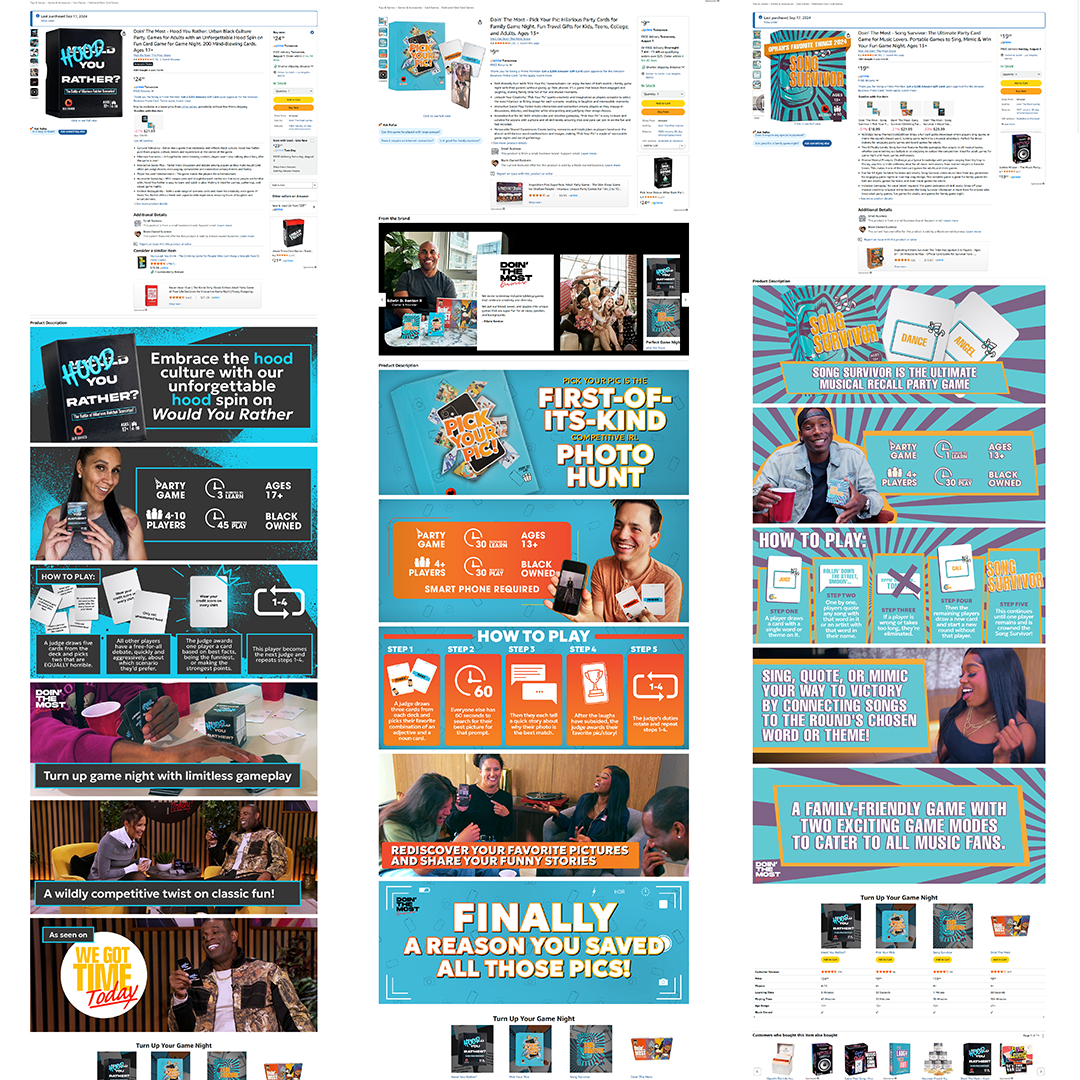 Also working with the team’s Amazon reps, I created all new storefront pages for all of Doin’ The Most’s game listings. This included their above the fold, product and A+ imagery and graphics.